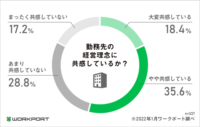 上図の調査によると、約半数の社員が、勤務先の経営理念に共感していないと回答しています。