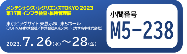 ROV MOGOOLシリーズの販売を行う JOHNAN株式会社(京都府宇治市:代表取締役社長兼CEO 山本 光世)は、取放水設備の設計・施工、環境コンサルタントや水中メンテナンスを行う株式会社東京久栄(東京都千代田区:代表取締役社長 高月 邦夫)、ROV MOGOOLシリーズ及びHy-CaTの販売店であるミカサ商事株式会社(大阪府大阪市:代表取締役社長 中西 日出喜)と2023年7月26日(水)~28日(金)に開催されるメンテナンス・レジリエンスTOKYO2023に出展します。