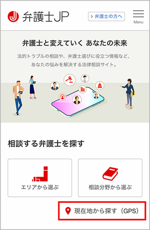 弁護士JP株式会社(本社:東京都港区、代表取締役:酒井将)は、このたび、法律相談サイト「弁護士JP(https://www.ben54.jp)」にGPS機能を利用した弁護士検索をリリースしたことをお知らせいたします。