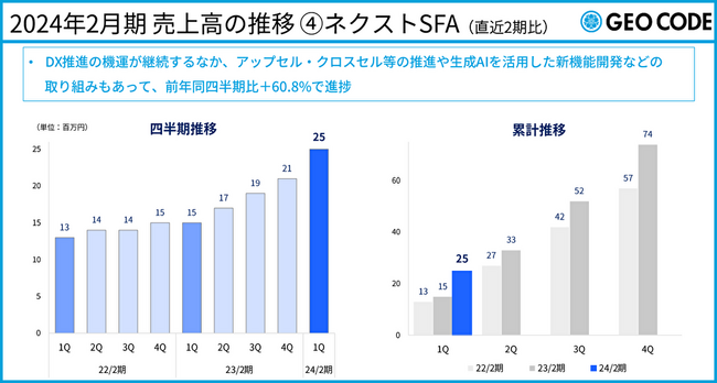 会社全体では、当第1四半期期初に発覚した不正事案への対応等の影響もあって、売上高359百万円(前年同四半期 362百万円)、営業損失30百万円(前年同四半期営業利益 8百万円)、経常損失25百万円(前年同四半期経常利益 16百万円)、四半期純損失16百万円(前年同四半期四半期純利益 10百万円)となりましたが、DX推進の機運が継続するなか、ネクストSFAは、アップセル・クロスセル等の推進や生成AIを活用した新機能開発などの取り組みもあって前年同四半期比+60.8%と順調に進捗しています。