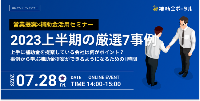 株式会社補助金ポータル(本社:東京都渋谷区、代表取締役:福井彰次)は「営業提案×補助金活用 2023上半期の厳選7事例」と題して無料オンラインセミナーを7月28日金曜日14時より開催します。Zoomでお気軽にご視聴いただけますので、ぜひご参加ください。