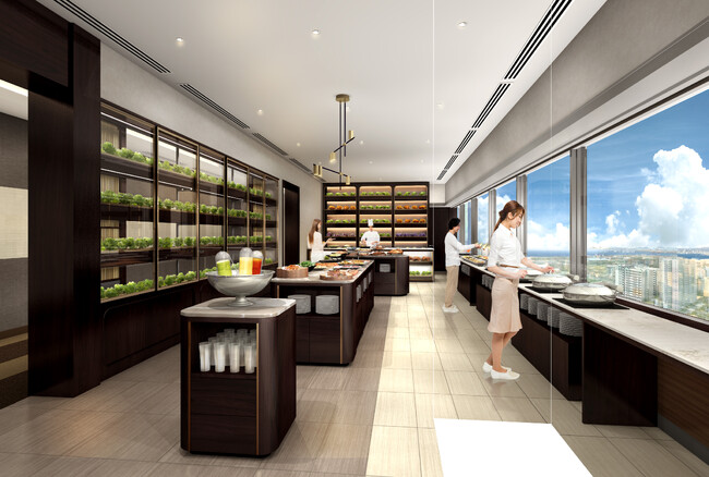 現在リニューアル工事中の18階パーティールーム「ボンボヤージュ」は、バイキングレストランとして生まれ変わります。一画には水耕栽培の設備を設置し、採れたての野菜をお客様にご提供いたします。壁一面の水耕栽培は、日本最長の10m。お客様自身の手で収穫した新鮮な野菜をその場でお召し上がりいただけます。ホテル内で採れた野菜をそのままお客様にご提供する、「究極の地産地消」システムとして、SDGs理念に沿った取り組みを目指しています。
