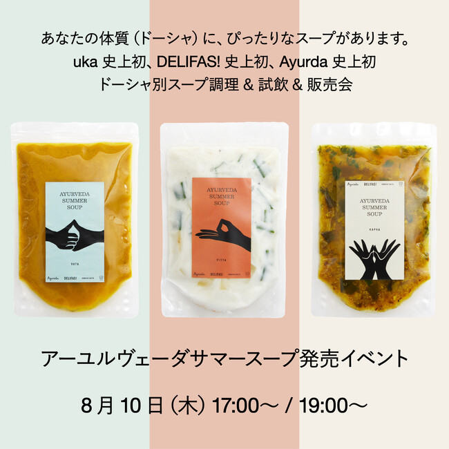 アーユルヴェーダの理論に基づきドーシャ(体質)に応じた3種類のスープを、 Ayurda 、DELIFAS!(デリファス)、ukaの3社で共同制作しました。