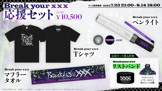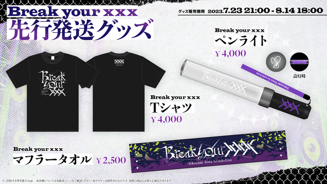 本公演開催に合わせ、本日7月23日(日)より常闇トワ 1stソロライブ “Break your ××דライブグッズヴィジュアルが解禁されました。