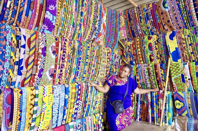 アフリカンプリントのルーツとなったのはインドネシア・ジャワ島の伝統工芸、ろうけつ染めの布「ジャワ更紗」と言われています。東インド会社などが交易をとおして、ろうけつ染めの技術がアフリカ地域やヨーロッパ地域へと伝わりました。産業革命期のイギリスやオランダでは、ろうけつ染めの技術を活かした機械捺染が開発され、そこで生産されたものがアフリカンプリント(ワックスプリント)の始まりとなりました。現代では、老舗企業のVLISCO(フリスコ)社のものが最高級プリントとされ、中国製の模倣されたプリントが流通しているものでは大部分を占めています。トーゴ共和国のアフリカンプリントを扱う女性商人は西アフリカ地域で初めての億万長者となり、トーゴ経済の礎を築きました。(彼女たちは通称「ナナ・ベンツ」と呼ばれました。「ナナ」は現地の言葉で「母」の意、ベンツは彼女たちが乗っていた「メルセデス・ベンツ」のこと。)