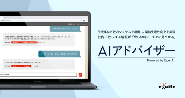 エキサイト株式会社(所在地:東京都港区、代表取締役社長:西條晋一、以下当社)は、自社におけるAI開発の知見を活かし、生成系AIと社内システムとの連携により業務効率化を実現するAIアドバイザーの提供を開始します。