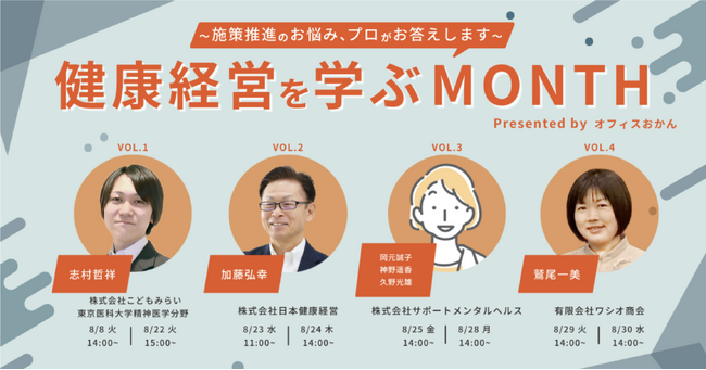 “働く人のライフスタイルを豊かにする”をミッションに、社会課題の解決に取り組む株式会社OKAN(代表取締役 CEO:沢木恵太 、本社:東京都豊島区)は、8月1日からの1ヶ月間、健康経営に関連する有識者や取り組みを推進する企業と連携して4つのウェブセミナーをおこなう『健康経営を学ぶMONTH ~施策推進のお悩み、プロがお答えします~』(https://bit.ly/43yAJAF)を開催します。
