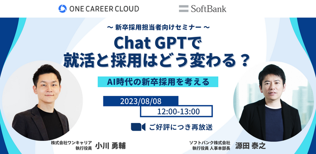 人事向け採用クラウド「ONE CAREER CLOUD」を提供する株式会社ワンキャリア(本社:東京都渋谷区、代表取締役社長 執行役員CEO:宮下 尚之、東証グロース:4377、以下ワンキャリア)は、2023年7月6日に開催したオンラインセミナー「ChatGPTで就活と採用はどう変わる?~AI時代の新卒採用を考える~」の再放送を2023年8月8日に放映いたします。イベント当日には企業の採用担当者など570名にご参加いただき、就活を取り巻くChatGPTの利活用状況や、新卒採用業務への取り入れ方について学ぶ場となりました。