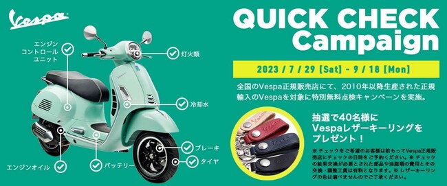 このキャンペーンは、本格的なツーリングシーズンを迎え、安心してお客様の愛車にお乗りいただくために、 ベスパ正規販売店による特定のチェック項目を無料で点検いたします。さらに、このクイックチェックキャンペー ンをご利用いただいた方の中から抽選で 40 名様に、Vespa レザーキーリングをプレゼントいたします。