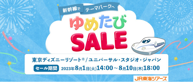 株式会社ジェイアール東海ツアーズ(本社:東京都中央区、以下JR東海ツアーズ)では、2023年8月1日(火)14:00から8月10日(木)18:00までの10日間限定で『新幹線でテーマパークへ!ゆめたびSALE』を開催します。往復新幹線とセットで「東京ディズニーリゾート(R)」、「ユニバーサル・スタジオ・ジャパン」提携のオフィシャルホテルを含む16施設が対象のWEB申込限定スペシャルプランをご用意!