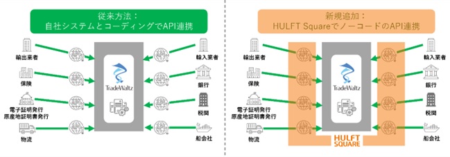 株式会社トレードワルツ(以下:トレードワルツ)は、貿易情報連携プラットフォーム「TradeWaltz(R)」(以下:TradeWaltz)のAPI利用拡大に向け、株式会社セゾン情報システムズ(以下:セゾン情報システムズ)が提供するiPaaS(クラウド型データ連携プラットフォーム)「HULFT Square(R)」を用いた実証試験で、TradeWaltzユーザーによる自社システム-TradeWaltz間のAPI連携にかかる手間や時間を飛躍的に効率化・短縮できることを明らかにしました。