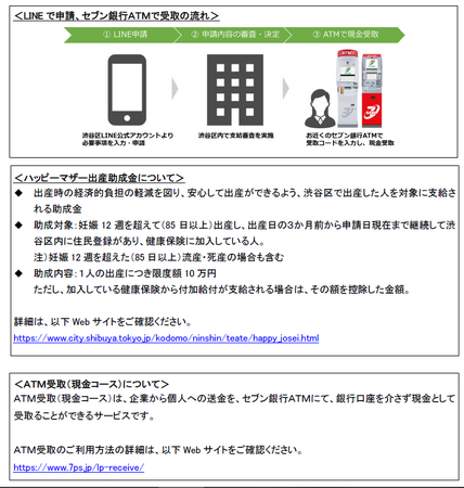 株式会社セブン銀行(本社:東京都千代田区、代表取締役社長:松橋 正明、以下 セブン銀行)と同社子会社である株式会社セブン・ペイメントサービス(本社:東京都千代田区、代表取締役社長:河邉 弦、以下 セブン・ペイメントサービス)は、東京都渋谷区(区長:長谷部 健、以下 渋谷区)、株式会社Bot Express(本社:東京都港区、代表取締役 中嶋 一樹)とともに、2022年7月1日より開始したハッピーマザー出産助成金・申請給付に係る実証実験の結果を踏まえ、「LINEで申請、セブン銀行ATMで受取」サービスが正式採用となったことをお知らせいたします。