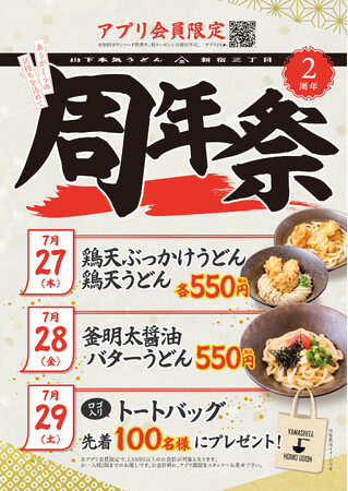 株式会社ガーデン(本社:東京都新宿区 代表取締役社長:川島賢 以下「当社」) が運営する、「山下本気うどん 新宿三丁目」は、2023年7月29日(土)にオープン2周年を迎えます。ご愛顧くださるお客様への感謝の気持ちを込めて、「山下本気うどん 新宿三丁目」へご来店のお客様※を対象に、周年祭を3日間限定で開催いたします。7月27日(木)は「鶏天うどん」「鶏天ぶっかけうどん」を特別価格の税込550円で、7月28日(金)は「釜明太醬油バターうどん」を特別価格の税込550円でご提供いたします。さらに7月29日(土)には、先着100名様限定で「イベント限定ロゴ入りトートバッグ」をプレゼントいたします。