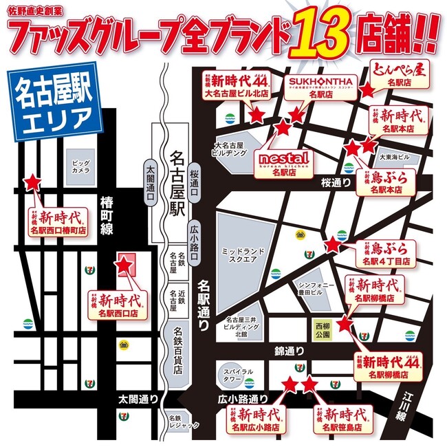フラッグシップブランド「新時代」等を全国150店舗展開する株式会社ファッズ(代表取締役:佐野直史)は、7月28日(金)に「新時代 名駅笹島店」をオープンさせて頂きます。名古屋駅のみで13店舗、名古屋市内35店舗と、日常利用されるお店だからこそのドミナント出店を実現。全国150店舗、ここ数年の値上げもせず、生ビール190円・名物の伝串1本50円を維持しております。