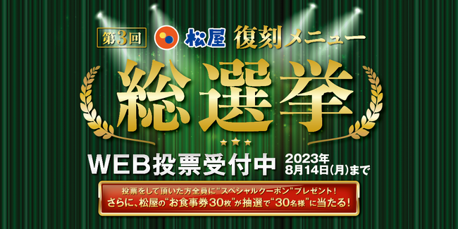 ご投票いただいた方全員に最大70円引き“スペシャルクーポン”をプレゼントいたします。また、投票後、専用フォームから応募いただいた方に抽選で30名様に「松屋お食事券30枚」プレゼント。さらに、今回の「第3回松屋復刻メニュー総選挙」は、毎日1回投票可能!是非あなたの一票でオススメのメニューを復刻させてください。