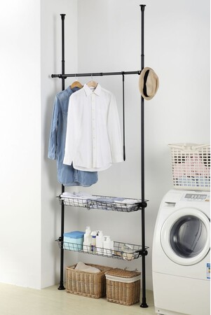 縦に突っ張るだけで簡単に設置でき、ハンガーポールとラックにたっぷり収納していただけます。