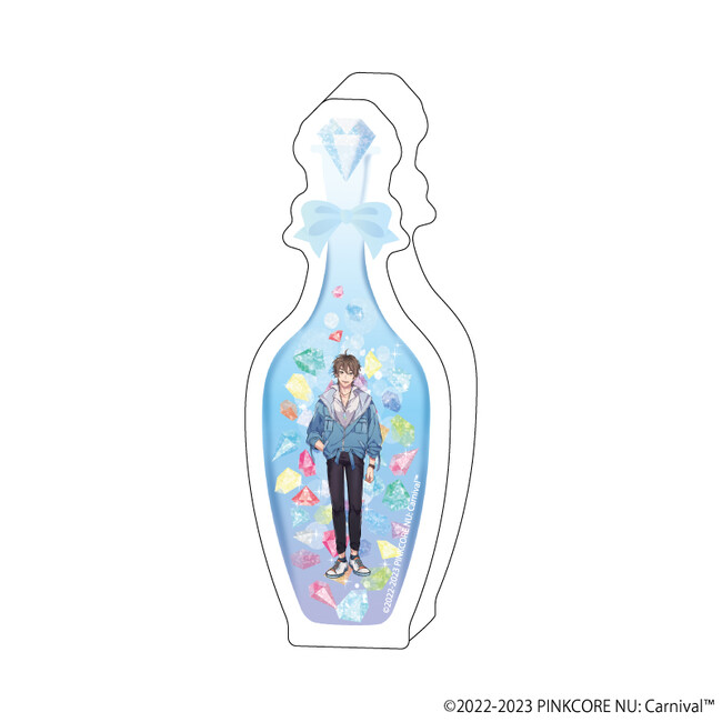 12×5cmのコレクションボトルは、奥行1cmの厚みがある自立可能なボトル型アクリルスタンドです。光に透かすとキラキラと輝いてみえ、色とりどりの宝石とエイトたちがより美しく華やかに。