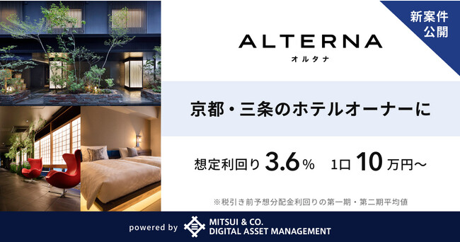 三井物産デジタル・アセットマネジメント株式会社(以下「当社」)は、当社が提供するデジタル証券を活用した安定資産投資サービス「ALTERNA(オルタナ)」において、2号案件「三井物産のデジタル証券~京都・三条~(譲渡制限付)」を公開しましたのでお知らせします。投資対象は「ホテルリソル京都 河原町三条」で1口10万円から申込みが可能、7月28日(金)17時より仮申込の受付を開始します。また8月1日(火)19時より本案件について解説するセミナーを開催します。