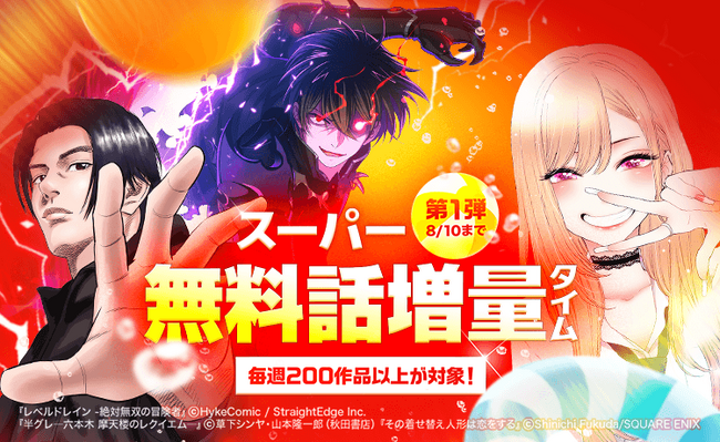 さらに、目玉イベントのひとつである「スーパー 無料話増量 タイム」では、本日より毎週200作品以上を対象に、多様なジャンルの人気作品の無料話増量を実施します。