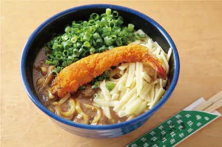 サラたまたっぷりのカレーうどんです。トッピングには、エビフライとチーズをのせてボリュームもたっぷりです!
