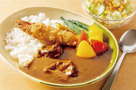 当店自慢のあしきた牛カレーに有頭海老フライと夏野菜を添えました。ボリューム満点。