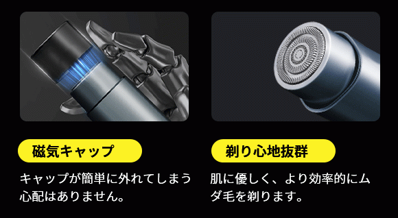キャップは磁気設計により、本体先端に自動的に吸着され、持ち運びや保管にも便利でカッターヘッドを清潔で衛生的に保ちます。多くのシェーバーとは異なり、キャップが簡単に紛失したり、鞄の中で移動中に落ちたりする心配はありません。
