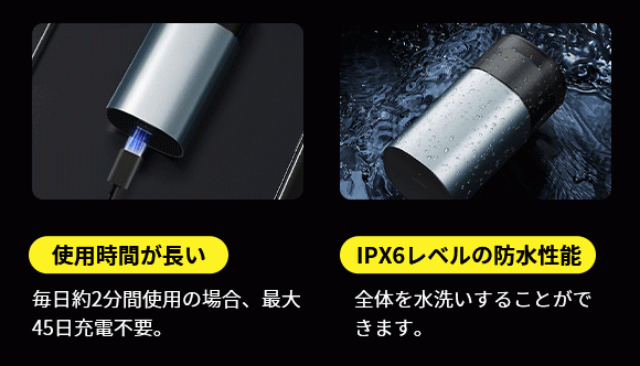 およそ60分でフル充電になり、なんと毎回2分間の使用で約45日間連続で使用できます。また、電源が切れた場合、3分間の充電をするだけで1回の髭剃りが行えます。出張や旅行などにも最適。