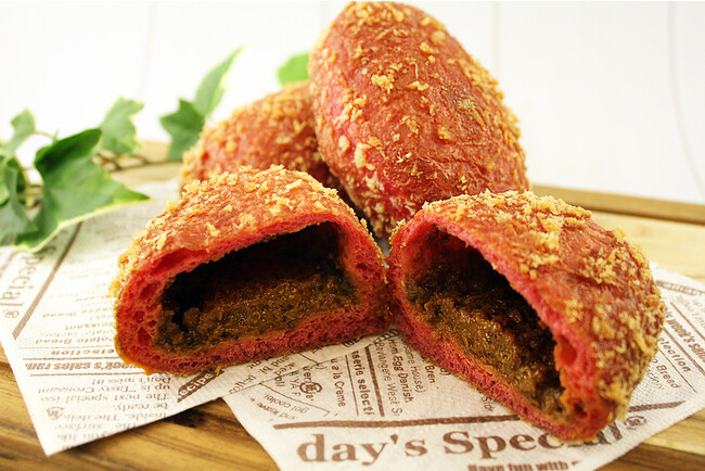ビーツを練り込んだ鮮やかな赤色の生地に、玉ねぎの旨み、スパイスの香り引き立つ辛口のインド風の鶏ひき肉のキーマカレーフィリングを包み揚げました。ビーツの鮮やかな赤色の見た目からも"HOT"なカレーパン。