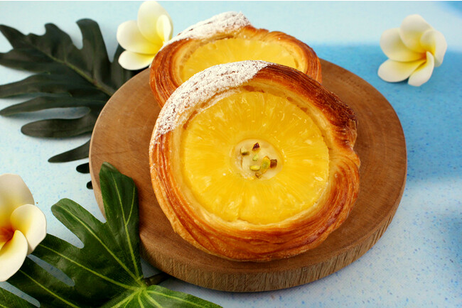 パイナップルスライスとレアチーズクリームの爽やかなサクサク食感のデニッシュです。インパクトのあるパイナップルとレアチーズ風味のクリームとの組み合わせで"COOL" ダウン間違いなし!