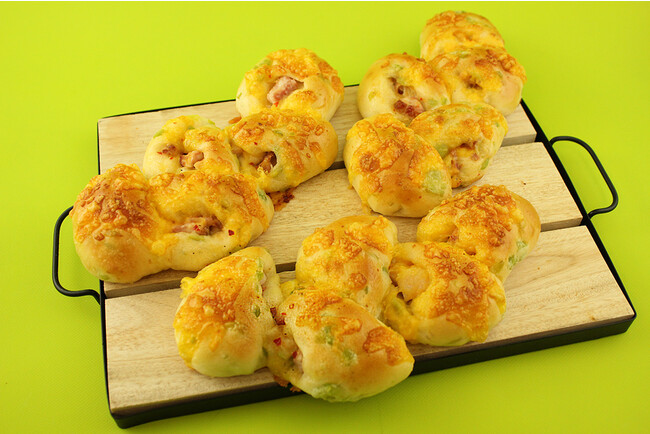 アヒージョ風味の枝豆を練り込んだ生地にベーコンを巻き込み、アヒージョソースをかけて焼き上げました。粒々食感の枝豆に、ベーコンがアクセント。"HOT"なアヒージョを感じながらお召し上がりください!