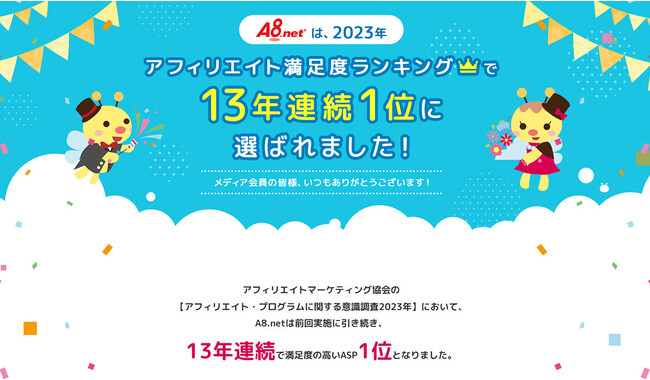 A8.net ASP満足度1位13年連続受賞記念ページ:https://support.a8.net/as/camp/asp2023/
