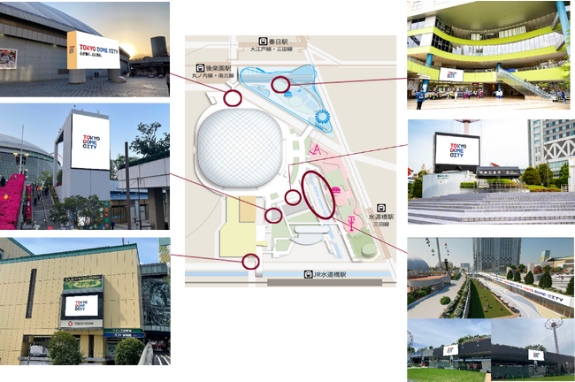 東京ドームは、2023年から2024年にかけて「東京ドームシティ」の大規模リニューアルを進めています。目玉施策の一つとして、東京ドームを中心に JR・都営地下鉄「水道橋駅」、東京メトロ「後楽園駅」、都営地下鉄「春日駅」の各駅に向けて放射線上に多数の LED ビジョンを増設し、東京ドームに向かうお客様の感動を増幅する空間の創出が計画されました。