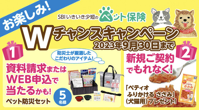 【SBIいきいき少短】ペット保険の資料請求またはWEB申込で「ペット防災セット」が抽選で当たる!~新規ご契約でもれなく「ペティオ ふりかけるささみ」をプレゼント~