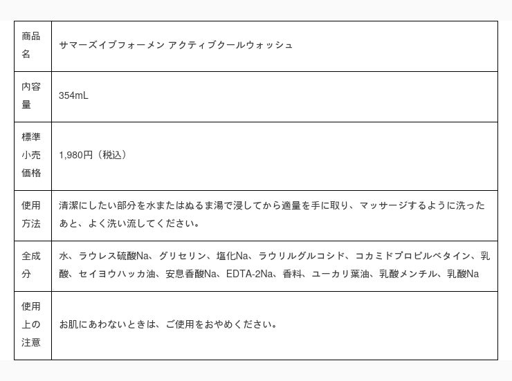 『サマーズイブフォーメン アクティブクールウォッシュ』は肌にやさしい穏やかな成分でつくられており、デリケートゾーンの pH に合わせて弱酸性に調整されています。