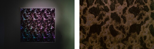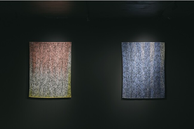 2枚の織物を重ね、光が透過すると発色する仕組みを持つインスタレーション。偏光板とOPPテープで構成された箔が織り込まれ、光が織物を重ねた状態で透過すると複屈折による光の干渉により偏光色が表れます。同じ素材ながらも偏光板の向きやテープの厚みを変えることで複数の色を表現し、また箔の順番のアレンジにより様々な色パターンを生成します。鑑賞位置によってもその見た目は動的に変化します。