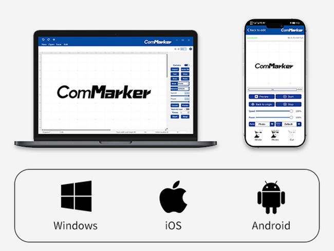 「ComMarker M2」は専用のアプリを使用して彫刻を行います。専用アプリはWindows、iOS、Androidと互換性がありますので、PCでもスマホでも専用アプリをご利用いただけます。