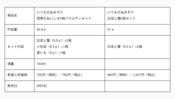 フリーズドライ「いつものおみそ汁」シリーズ 『いつものおみそ汁 四季のおいしさ5食バラエティセット』『いつものおみそ汁 白菜と蟹6食セット』 9月4日発売