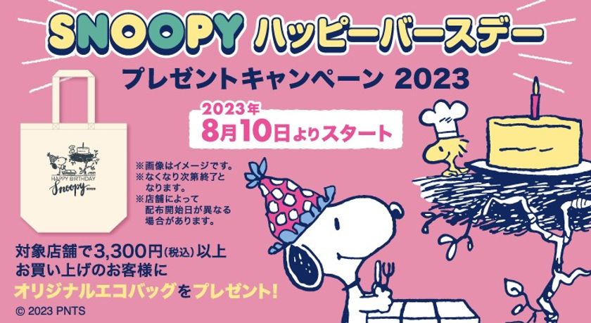 キャンペーンでは、2023年8月10日(木)から対象となる「ピーナッツ」公式ショップ各店で税込み3,300円以上のお買い上げのお客様にキャンペーンオリジナルデザインのエコバッグ(非売品)を1つプレゼントいたします。(各店舗での準備数に限りがあるため、無くなり次第終了となります。)
