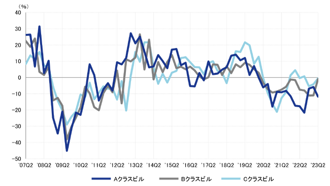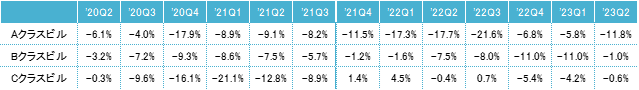 2022年第2四半期との比較による対前年変動率は、Aクラスビルがマイナス11.8%、Bクラスビルがマイナス1.0%、Cクラスビルがマイナス0.6%だった。A・Bクラスビルは13期連続、Cクラスビルも3期連続のマイナスとなった。3期連続して全てのクラスで対前年同期比マイナスとなったものの、BクラスビルとCクラスビルはマイナス幅が縮小しており、今後は対前年変動率がプラスに転じる可能性もある。