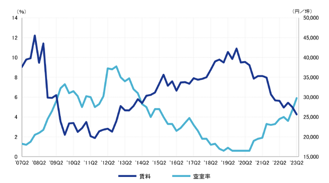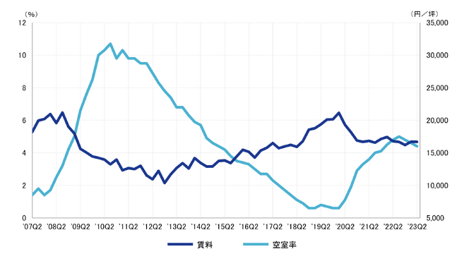【出所】 賃料:三幸エステート・ニッセイ基礎研究所 空室率:三幸エステート