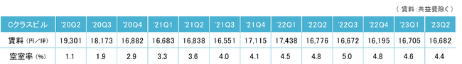 2023年第2四半期のCクラスビル賃料は前期比マイナス23円/坪の16,682円/坪(共益費除く)となった。再び下落したもののわずかな動きに止まり、賃料は2020年第4四半期以降、横ばい傾向が継続している。