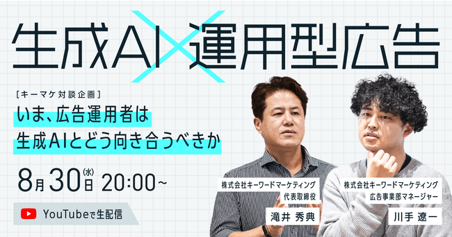 株式会社ベクトル(本社:東京都港区、代表取締役会長兼社長:西江 肇司、東証プライム:6058)の子会社である株式会社キーワードマーケティング(東京都中央区、代表取締役、滝井 秀典、以下「当社」)は、YouTubeライブにて『【キーマケ対談企画】いま、広告運用者は生成AIとどう向き合うべきか』を 8月30日 (水)20時から配信します。