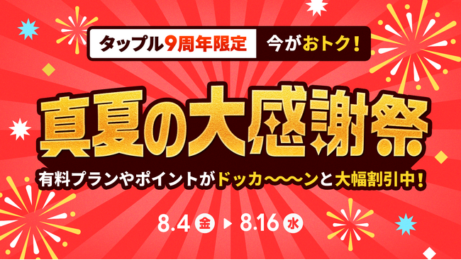 株式会社タップル(本社:東京都渋谷区、代表取締役社長:飯塚勇太)は、運営するマッチングアプリ「タップル」にて2023年8月4日(金)より、夏のお得なキャンペーンを実施することをお知らせいたします。