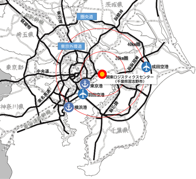 にしてつ関東ロジスティクスセンターは、東関東自動車道 湾岸千葉ICから車で約7分の場所に位置し、関東域内の集配送にも便利なほか、羽田空港・成田空港・横浜港・東京港から40km圏内と、航空・海上輸送サービスの提供に適した立地にあります。当センターの延床面積は約20,000平方メートル で、当社国内物流拠点におけるフラッグシップと位置づけております。
