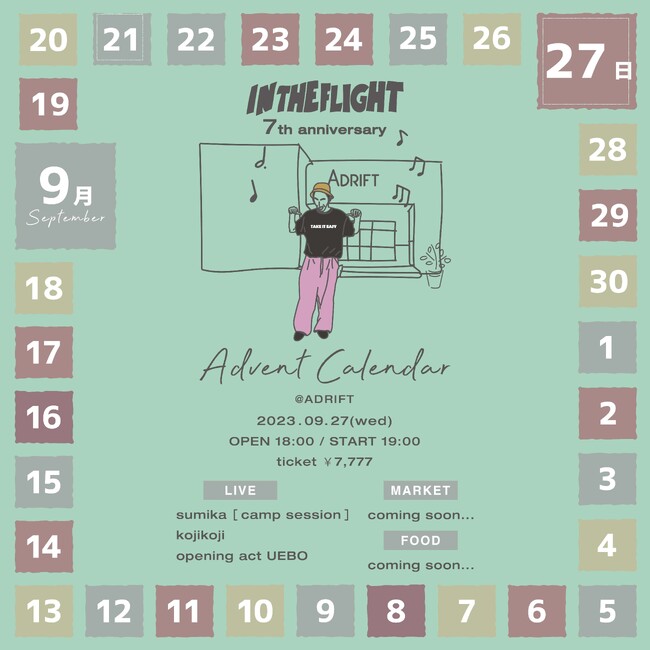 IN THE FLIGHTが7周年企画として展開してきたイベントのラストを飾る『Advent Calendar』を、9月27日(水)に下北沢ADRIFTにて開催。ライブアクトにsumika[camp session]、kojikoji、UEBOの出演が決定した。
