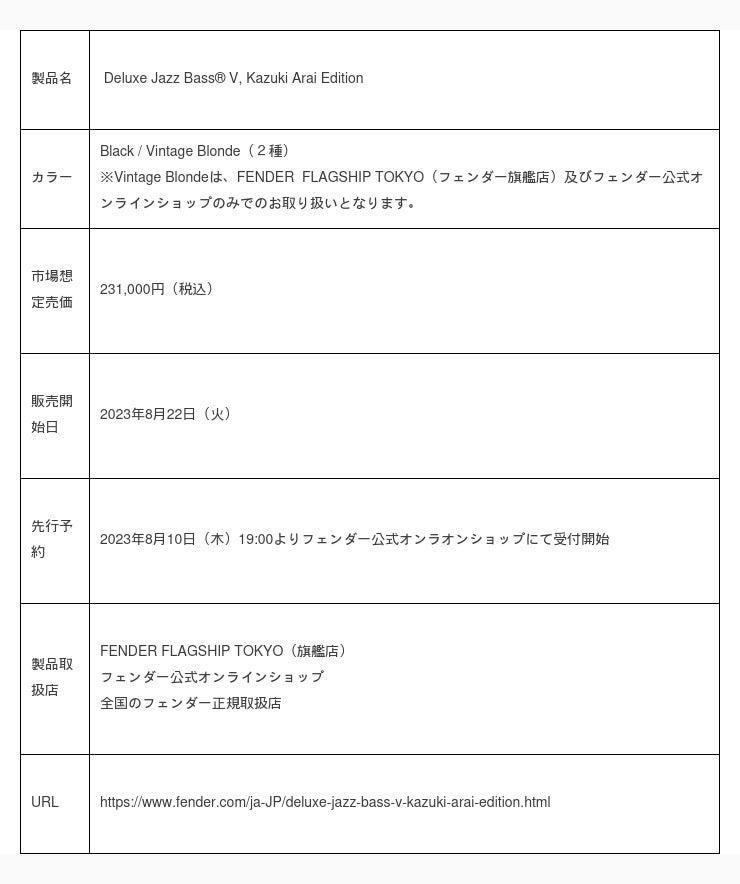 フェンダーミュージック株式会社(所在地:東京都渋谷区、代表取締役社長アジアパシフィック統括 エドワード・コール)は、King Gnuやmillennium paradeのメンバーとして活躍する新井和輝の新シグネイチャーベース『Deluxe Jazz Bass(R) V, Kazuki Arai Edition』を2023年8月22日(火)に発売することを発表しました。8月10日(木)夜7時より、フェンダー公式オンラインショップにて本モデルの先行予約を開始します。