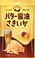 「バター醤油さきいか」は醤油の塩味と甘味、バターのコクと風味を絶妙に調和した味わいです。バターがとろ~り溶けているような食欲そそるパッケージに仕上げております。