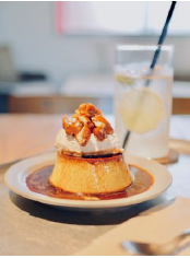 クリームとナッツが乗ったプリンの高さが表現できるよう、目線を低くして撮影しました。