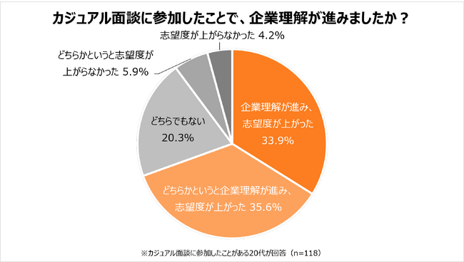 カジュアル面談に参加したことで、「企業理解が進み、志望度が上がった」と回答した20代が33.9%に上りました。「どちらかといえば企業理解が進み、志望度が上がった」35.6%を合わせると、カジュアル面談を通じて「志望度が上がった」とした20代が7割に迫りました。