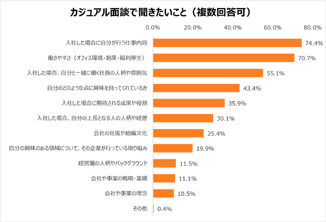 カジュアル面談で聞きたいことは、「入社した場合に自分が行う仕事内容」が74.4%で最多。次いで、「働きやすさ(オフィス環境・制度・福利厚生)」70.7%、「入社した場合、自分と一緒に働く社員の人柄や雰囲気」55.1%が続きました。カジュアル面談を通じて、入社後の仕事や配属部署の雰囲気を知りたいという意向がうかがえます。